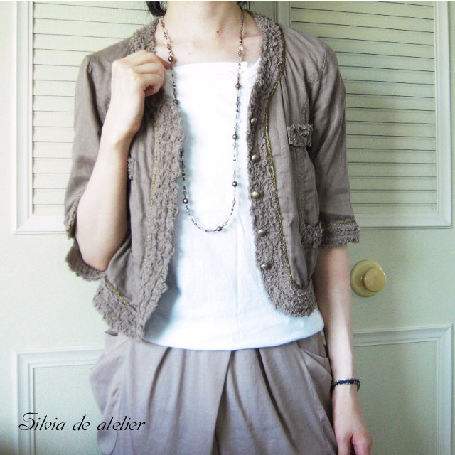 ブラウンカラーのコットンパールなどを引き締め効果にはさんでいますので