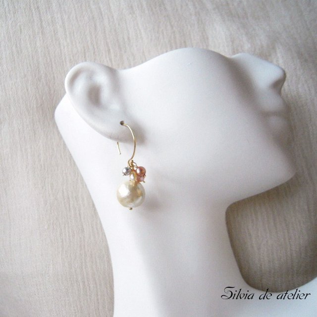 コットンパール10mm珠をメインにしたシルキーな色合いのピアスです