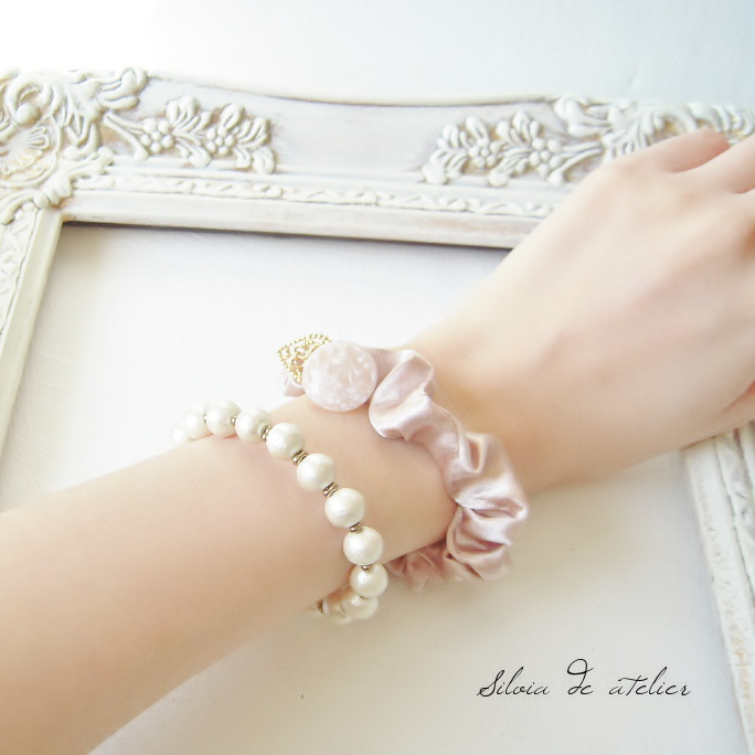 チェコボタン ベージュ付 ピンクベージュサテン シュシュ(ヘアアクセサリー) [O0107]