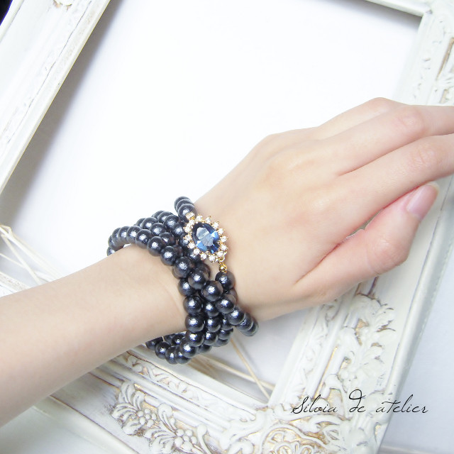 スワロフスキービジュー留め具 ブルーブラックコットンパールロングネックレス