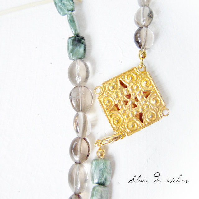 5WAY ヴィンテージ金具 スモーキークォーツタンブル×セラフィナイト ロングネックレス