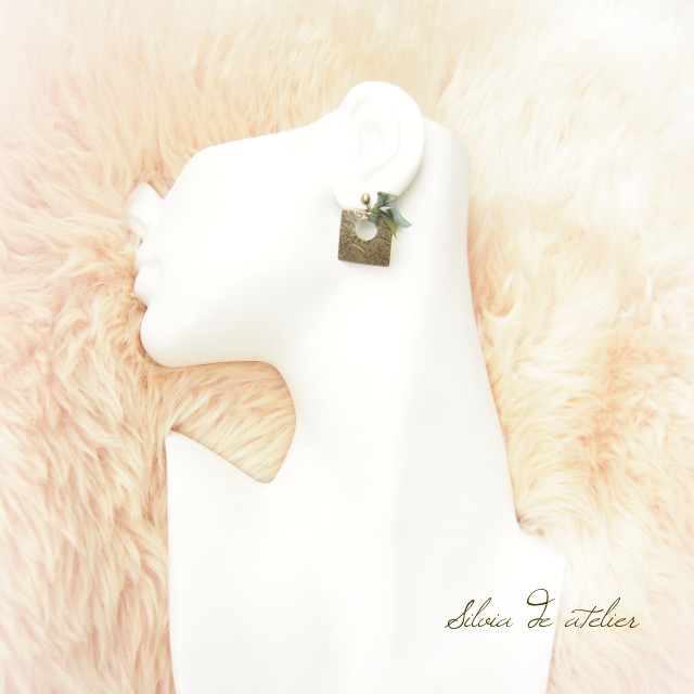 スクエア アンティークゴールドメタル グリーンシルクリボン イヤリング