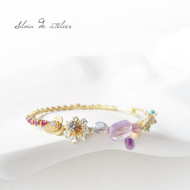 vintageピンクスワロフスキー アメジストドロップ真鍮フラワー バングル