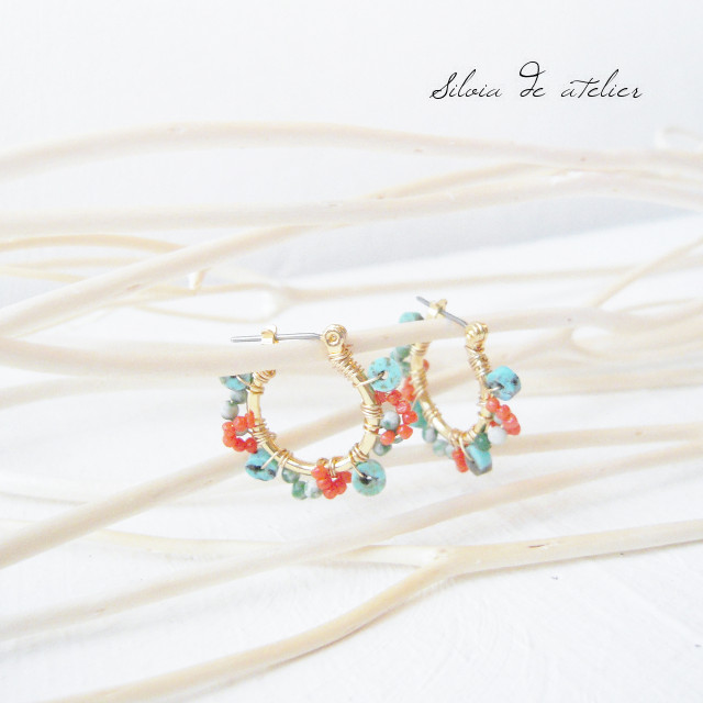 コーラル×ターコイズ×ソーシュライト チタンポストピアス