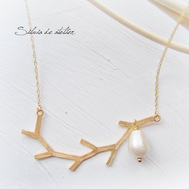 残り1 オフホワイトコットンパール ゴールド鹿の角チャーム 14kgfネックレス約55cm