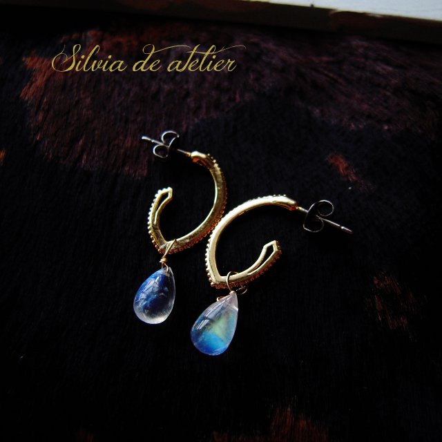 AAAブルームーンストーン スムースドロップ 一粒 ゴールドメッキ Vフックチタンポストピアス