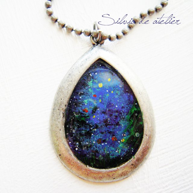 【Forest シリーズ】 夜の森を歩く 樹脂カボション アンティークシルバー ロングネックレス