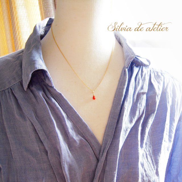WEB店限定・残り僅か 半額SALE イタリアサルディーニャ産天然レッドコーラル ミニスムース ドロップ サージカルステンレスネックレス [N01343]