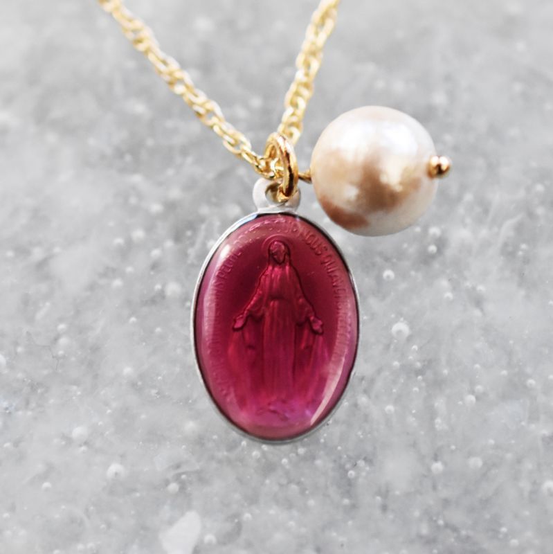 ピンクの色合いが目を惹くメダイネックレス