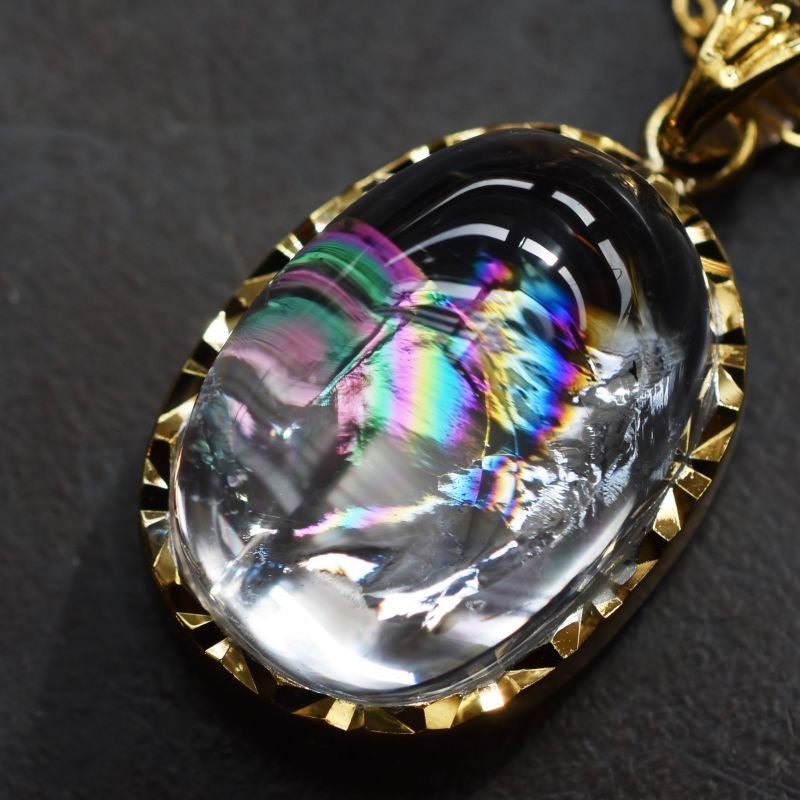 【1点もの・オーバルA】幸運を呼ぶ虹色 アイリスクォーツ カボション フレーム 14kgf約50cmチェーンネックレス