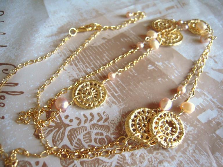ピンク系の淡水パールを組み合わせたロングネックレスです