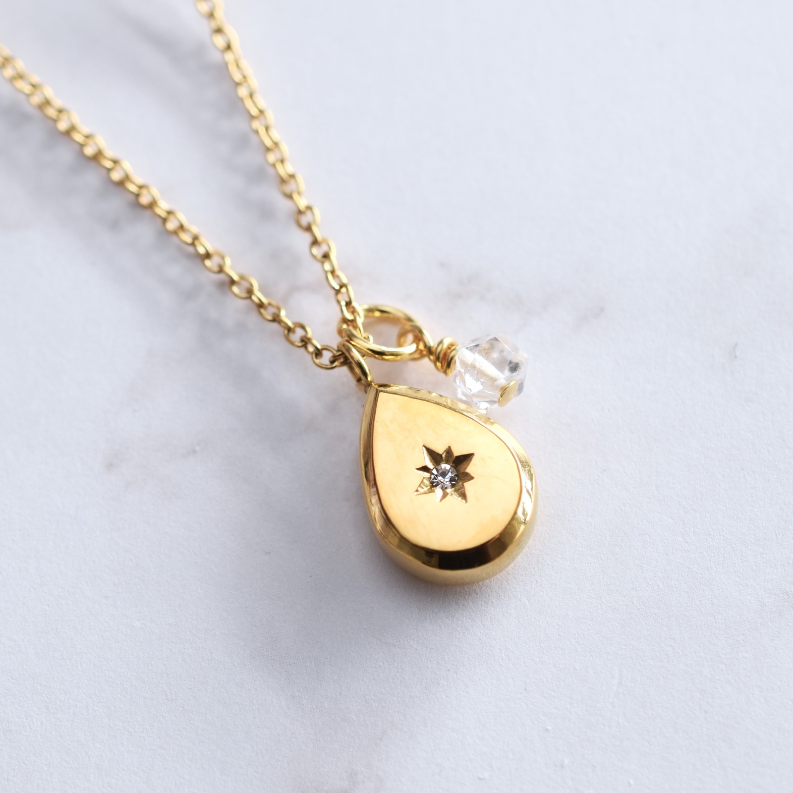 春の新作 NYハーキマーダイヤモンドクォーツ ジルコニア ティアチャーム サージカルステンレスネックレス40cm