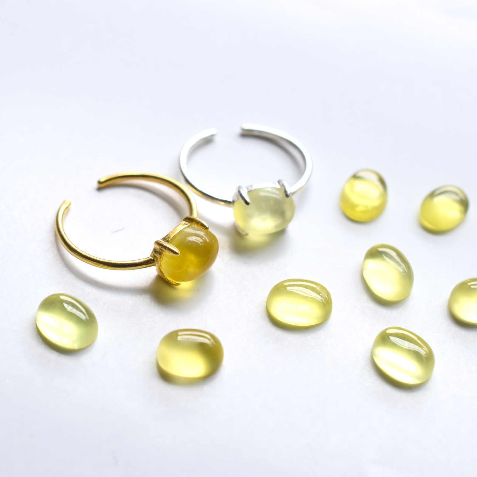 天然イエロープレナイトカボションの一粒リングとなります