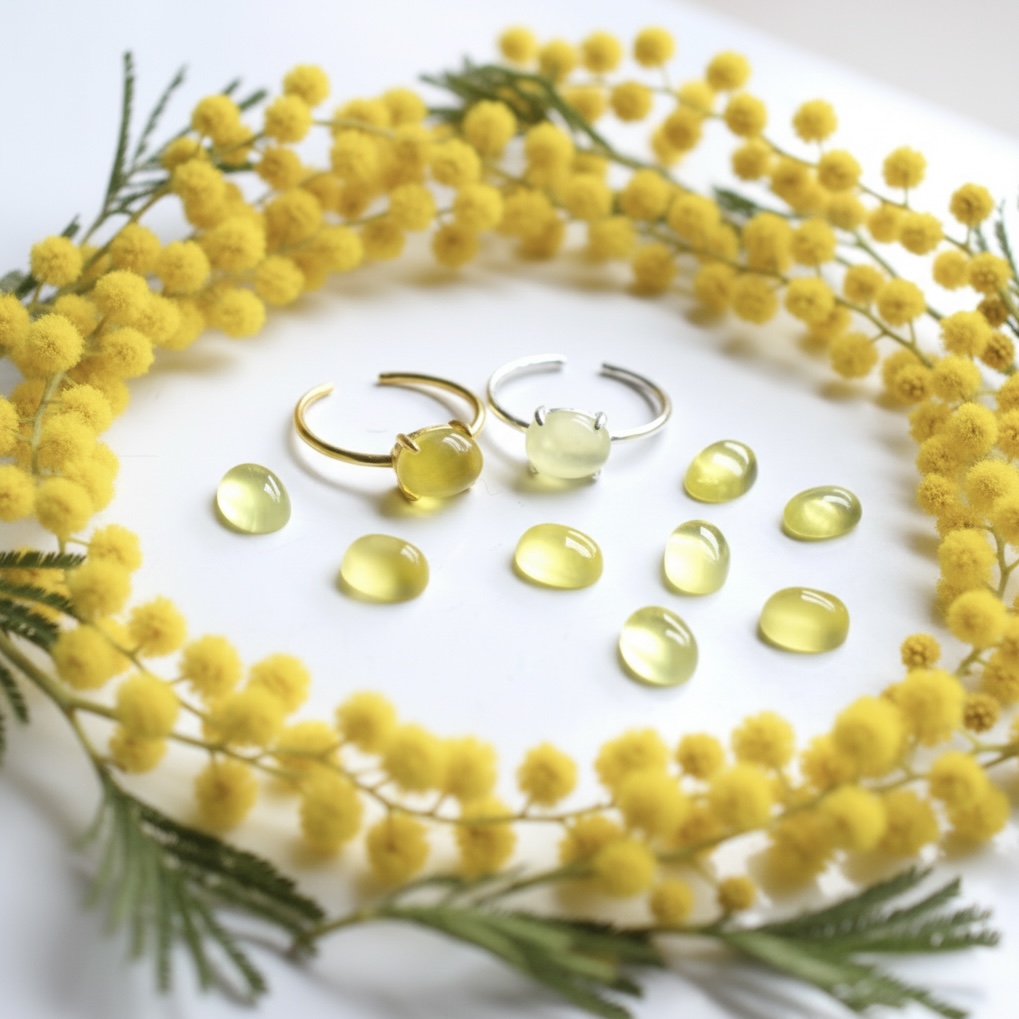 春の新作【金属アレルギー対応】天然カラー ミモザ イエロープレナイト オーバル カボション SVリング(指輪)